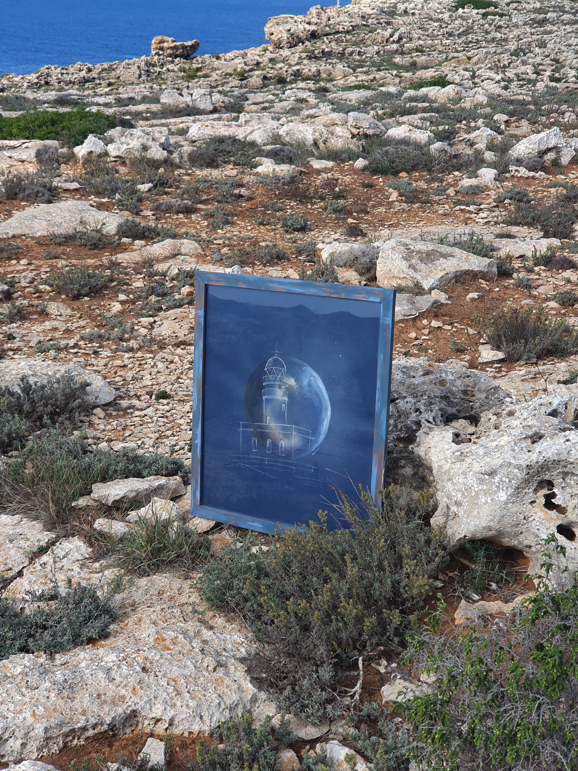 Cuadro pintado en acuarela sobre papel azul. Menorca, Isla de los 7 faros. Cavallería representa uno de los faros más destacados del norte de Menorca. Uno de los lugares más bonitos para ver una puesta de sol. Medidas: 55,5 x 63cm
